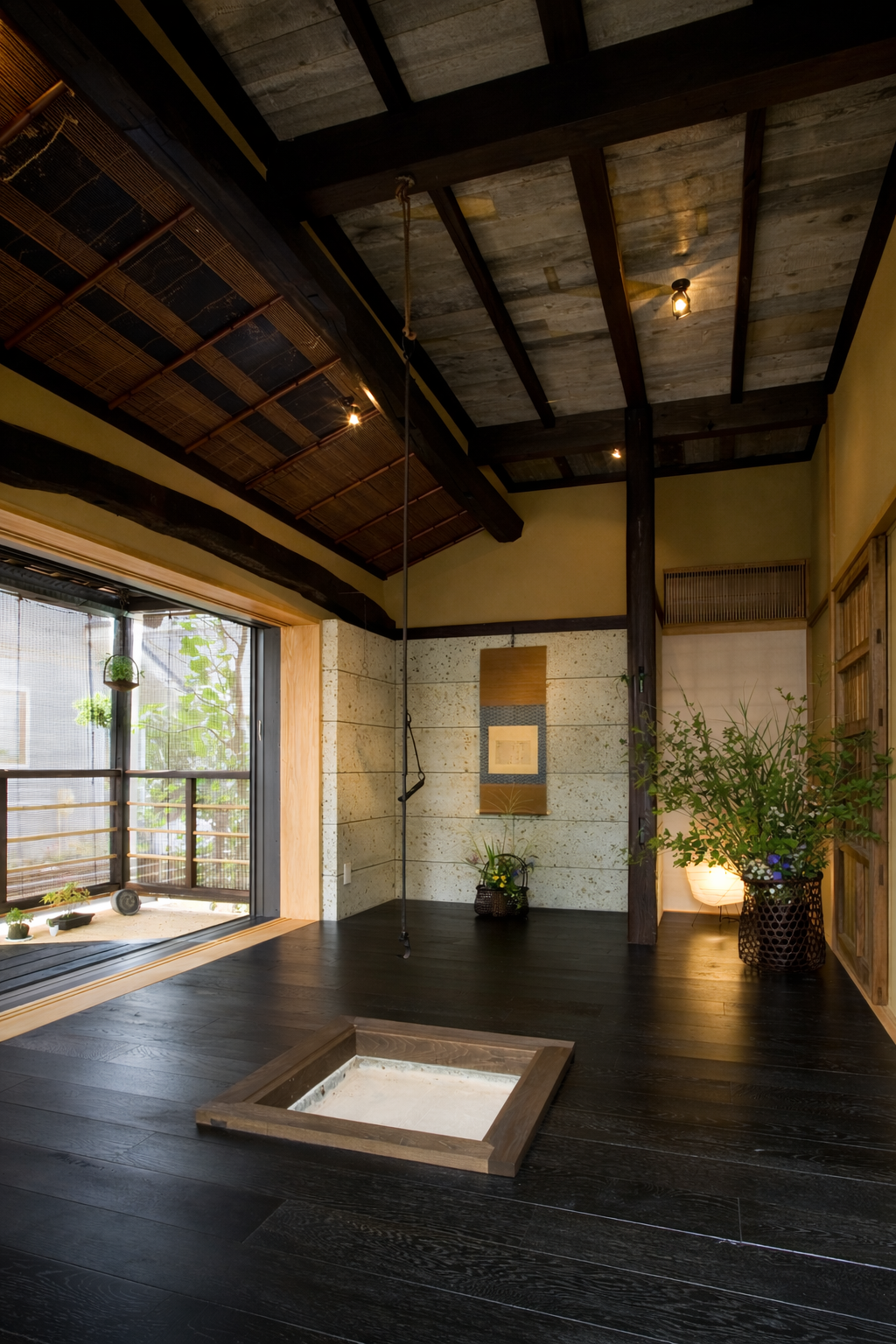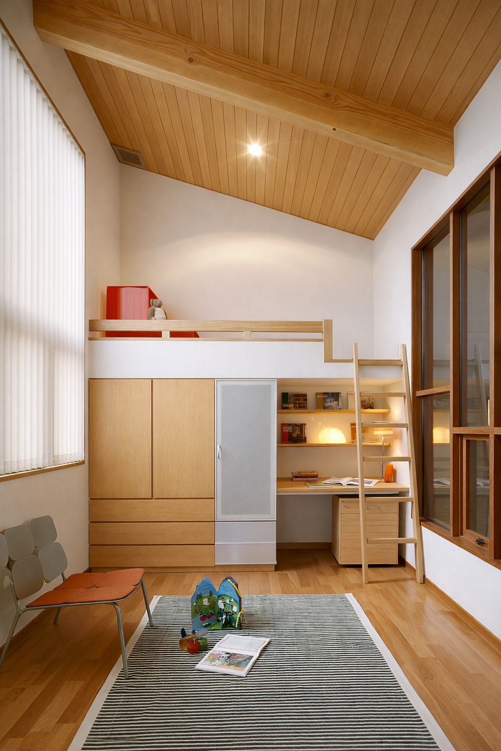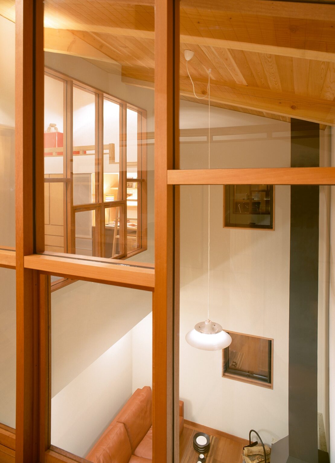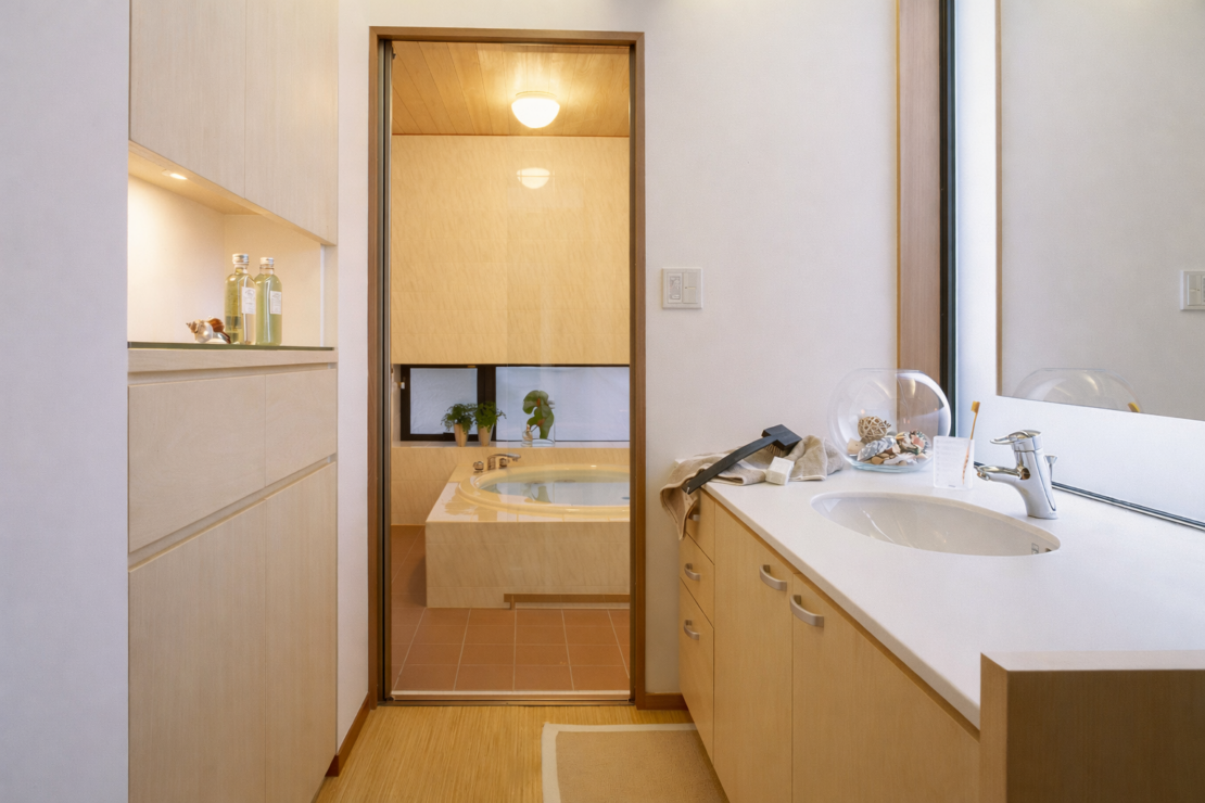 室内の中心となるリビングは、暖炉を据えた吹き抜け空間。上下階がひとつの気配でつながり、子ども部屋とは室内窓を介して緩やかに視線と声が交わります。家族それぞれの居場所を尊重しながら、自然とつながりを感じられる構成です。非日常の心地よさと、日常の安心感が共存する、アーバンリゾートという暮らし方をかたちにしました。