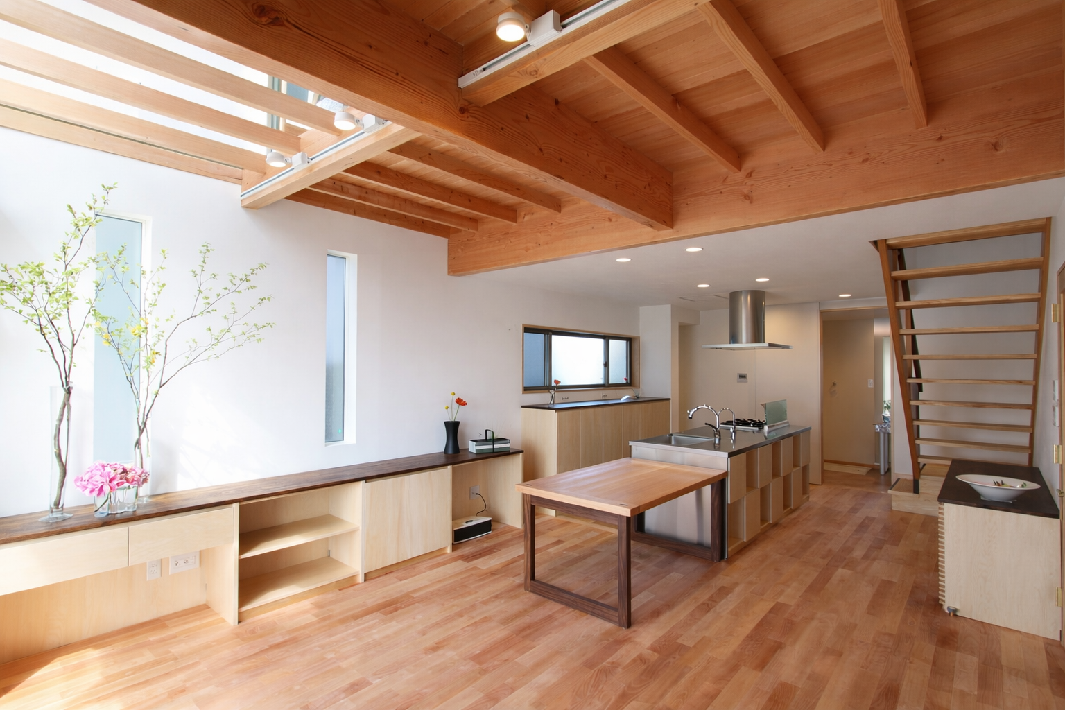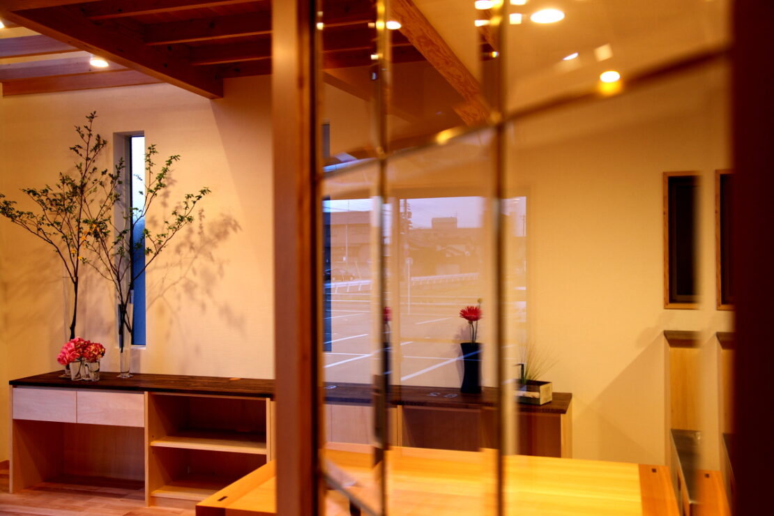 アルプスの山荘〈ヒュッテ〉を思わせる、落ち着きと力強い佇まいを住まいに重ねました。外から内へと続く動線は、山道を一歩ずつ登るような感覚。木と土の素材感に包まれながら、視界がゆっくりと開け、やがて家の中心へと導かれます。梁を現した天井や自然光が降り注ぐ空間は、山荘のような温もりと開放感を併せ持ち、家族の時間を静かに受け止めます。日常にいながら、心が深呼吸するような暮らしを叶える住まいです。