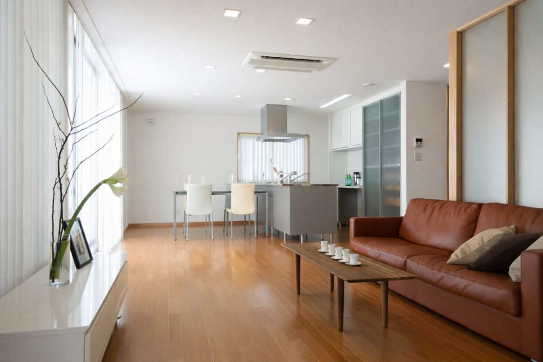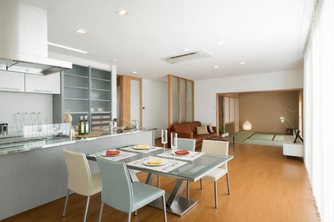 室内はキッチンを中心に、ダイニング、リビング、そして奥の和の空間へと緩やかにつながる構成。