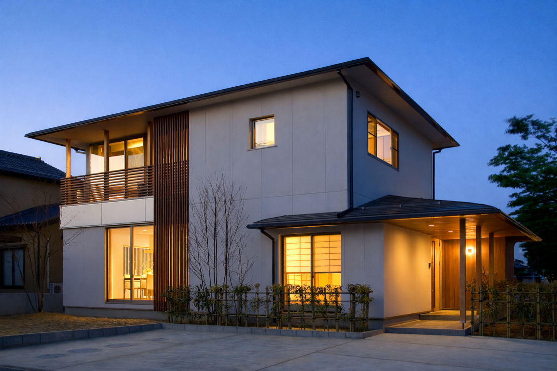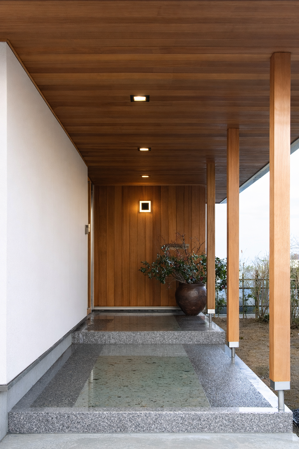 白を基調とした端正な外観に、横に深く伸びる軒と優しく添えるバルコニーの木手すり。そこに縦に伸びる木格子と柱が陰影を添える住まい。玄関へと続くアプローチは、家族との団らんと安らぎ感を高めてくれます。
