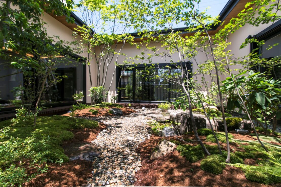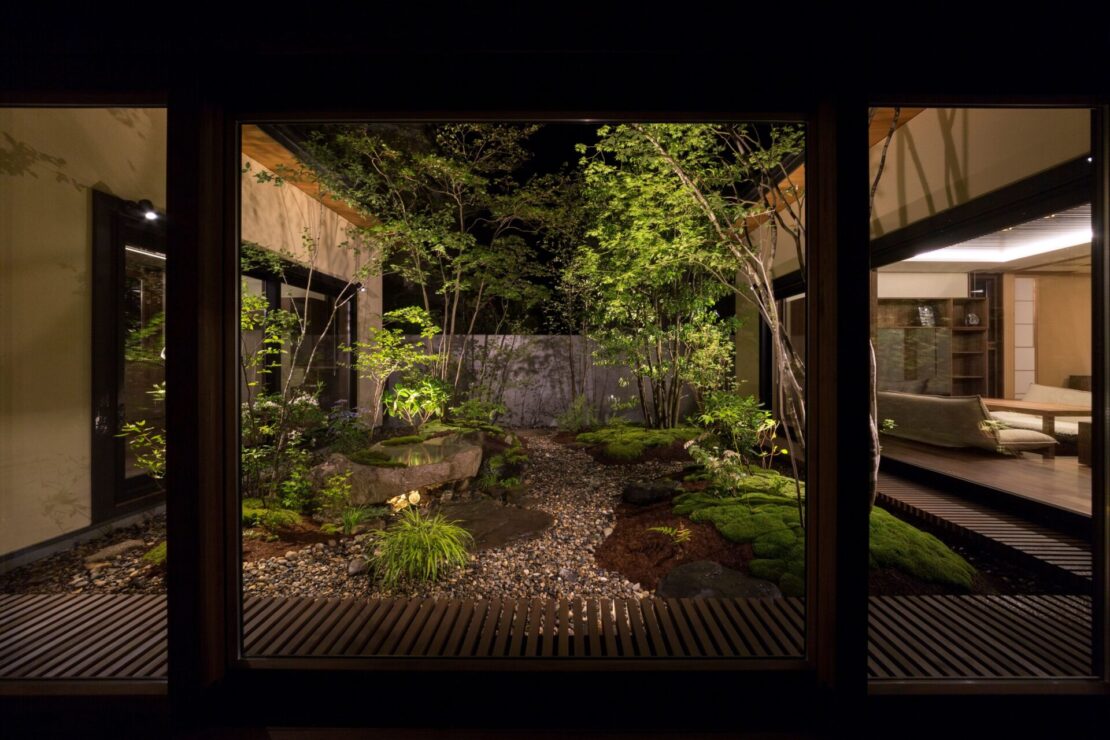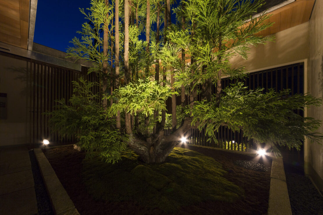 室内は、どの部屋からも苔庭と植栽を望める構成とし、水平に広がる視線の先に、緑の風景が連なります。まるで海に浮かぶ島々のように点在する苔の景は、光を受け、木々の影と重なり合いながら刻々と表情を変えていきます。建築と緑、光と影が溶け合い、風情と情緒を深く味わうための住まいとしました。