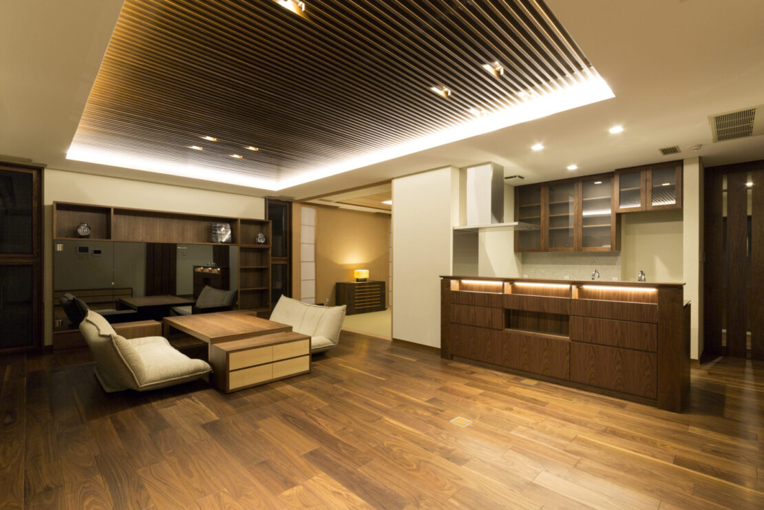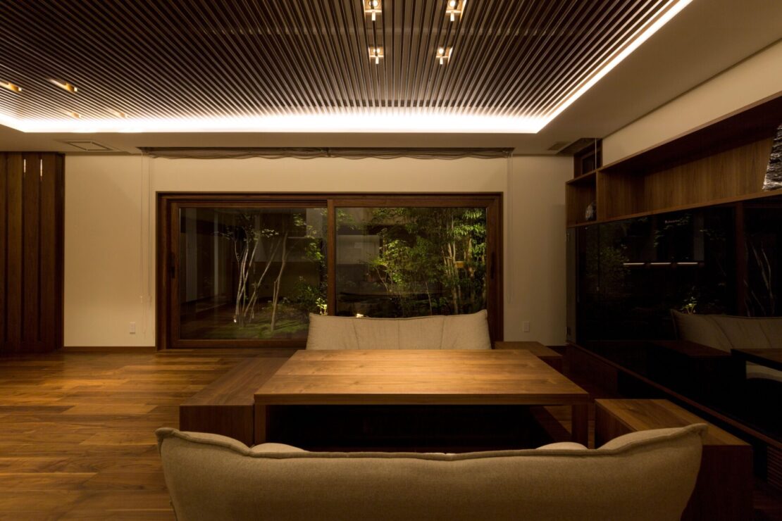 建物全体を貫く水平ラインと、深く伸びる軒が、この邸宅に落ち着きのある品格をもたらしています。正面エントランスにはシンボルツリーとして台杉(北山杉)を据え、石畳とともに外と内を緩やかにつなぐアプローチを構成しました。軒下に生まれる陰影は、時間の移ろいを静かに映し出し、訪れる人の視線と意識を自然と室内へと導きます。