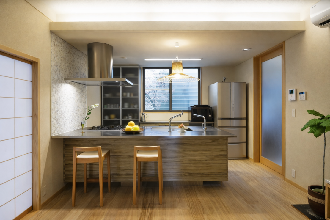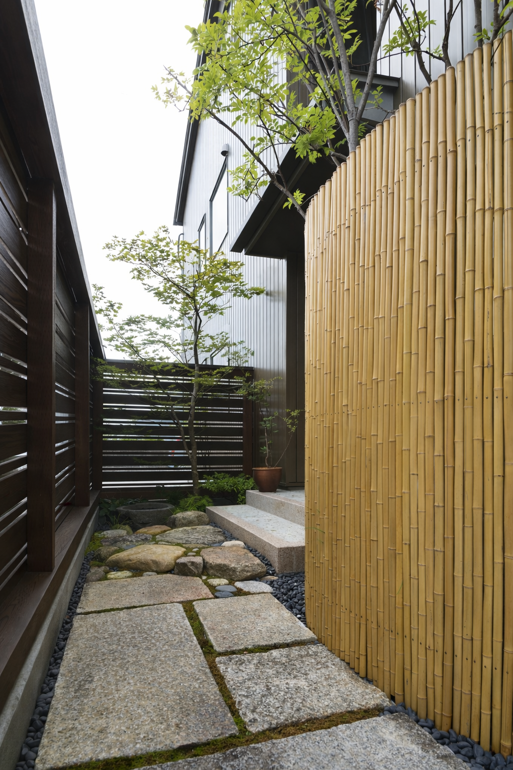 竹垣と植栽に石を組み合わせたアプローチは、山道を一歩ずつ登っていくようなストーリー性を持たせ、外の喧騒から距離を取り、気持ちを整えながら、住まいの奥へと導いてくれます。