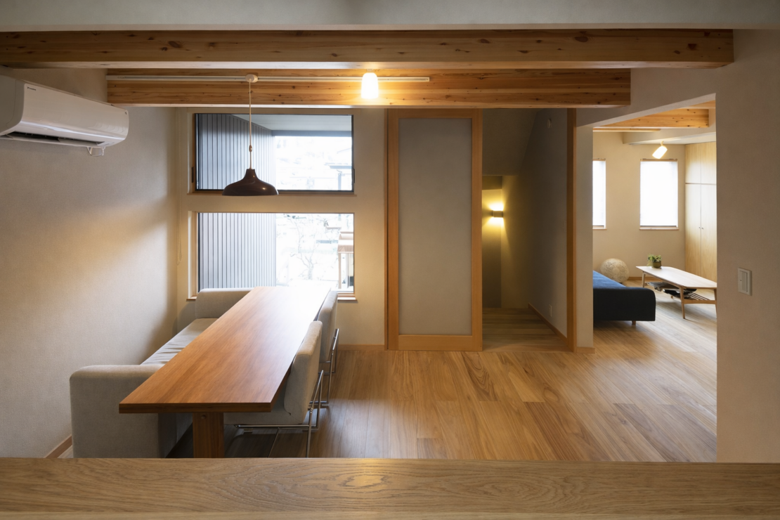 家に近づくほどに視界は穏やかに閉じ、内へ入ると静かな安らぎが広がる構成。